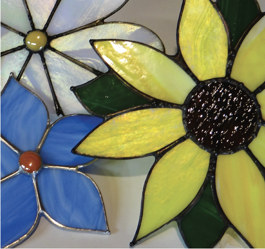 Come make a beautiful Flower “garden stake”. You will choose a 5 or 6 petal flower pattern. (several flower petal options will be available). You will have a choice of 3 foot, 4 foot, or 5 foot stakes. Students will choose their own glass, and will learn to cut, grind, foil and solder the glass. Cleaning and sanding will be done in class, and you will leave with a completed project in hand. The sturdy garden stake can stay in your yard all year round, and the flower can easily be brought inside for the winter.