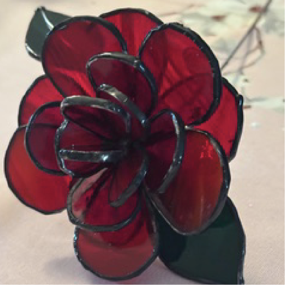 Intermediate Stained glass workshop. 3dimensional rose on a brass rod. A forever rose for someone special. You be cutting glass, foiling glass, soldering in a 3 dimensional form. Some knowledge and experience in cutting and soldering is required for this workshop.
